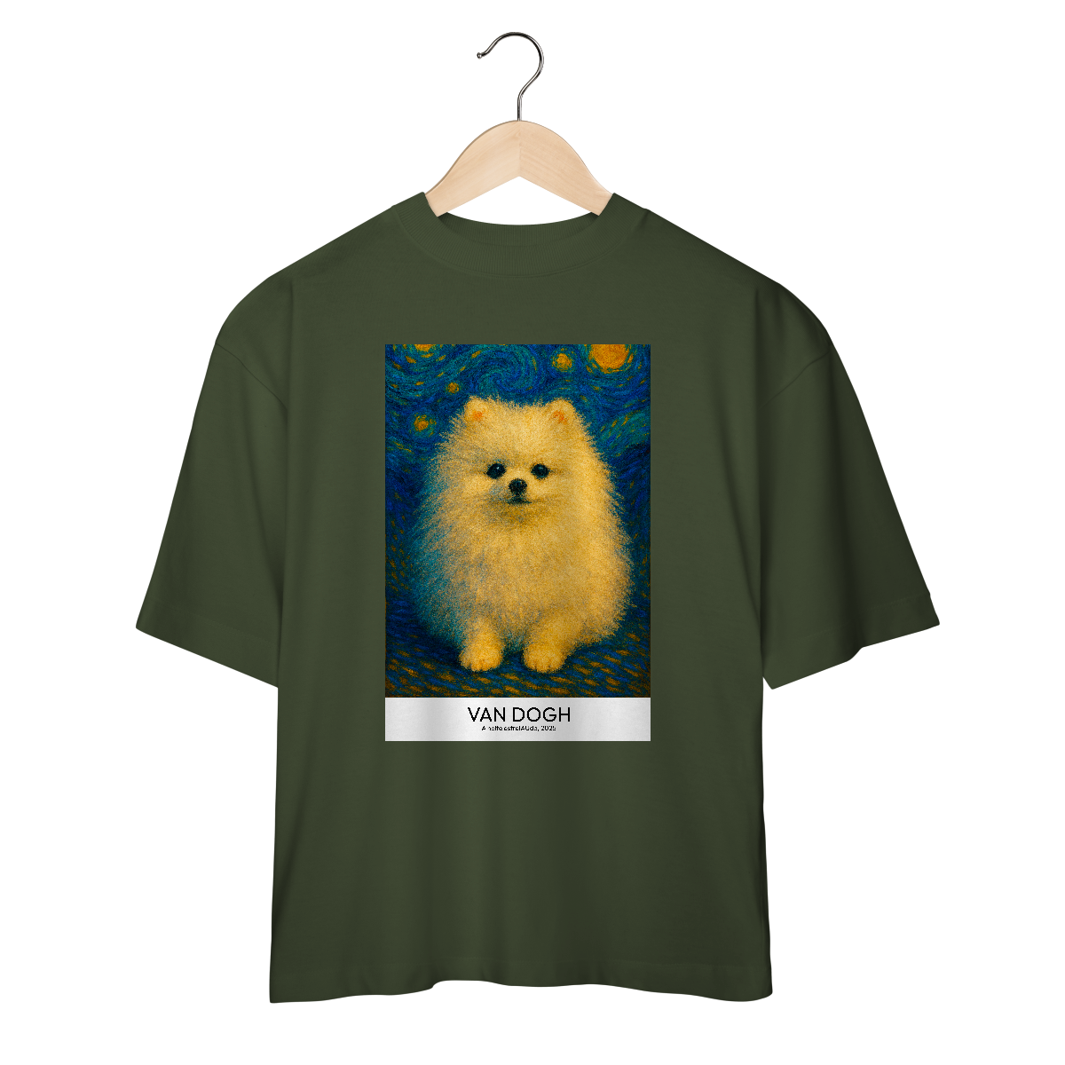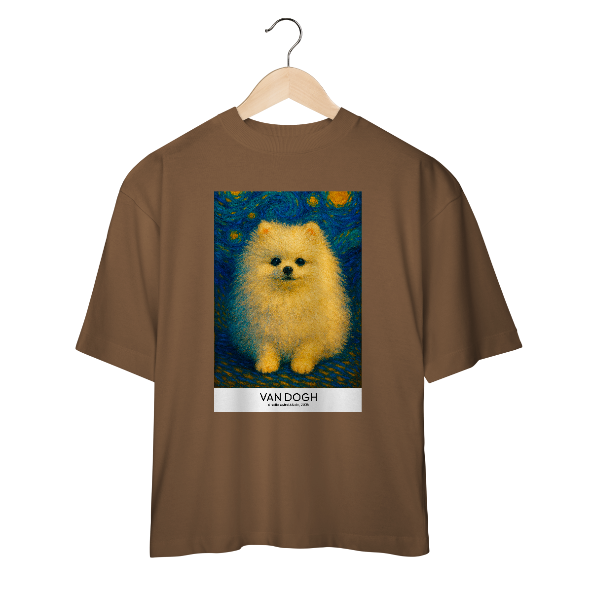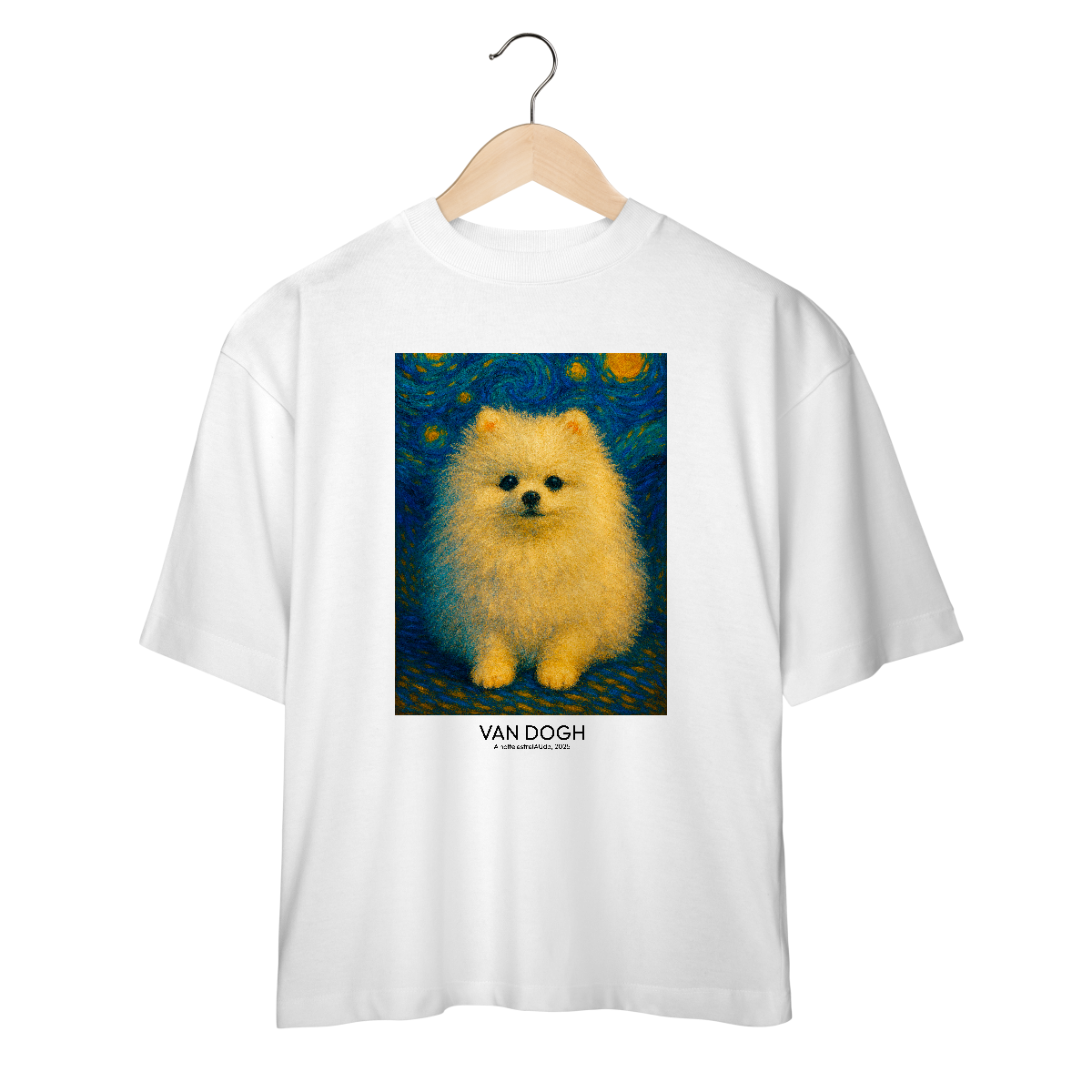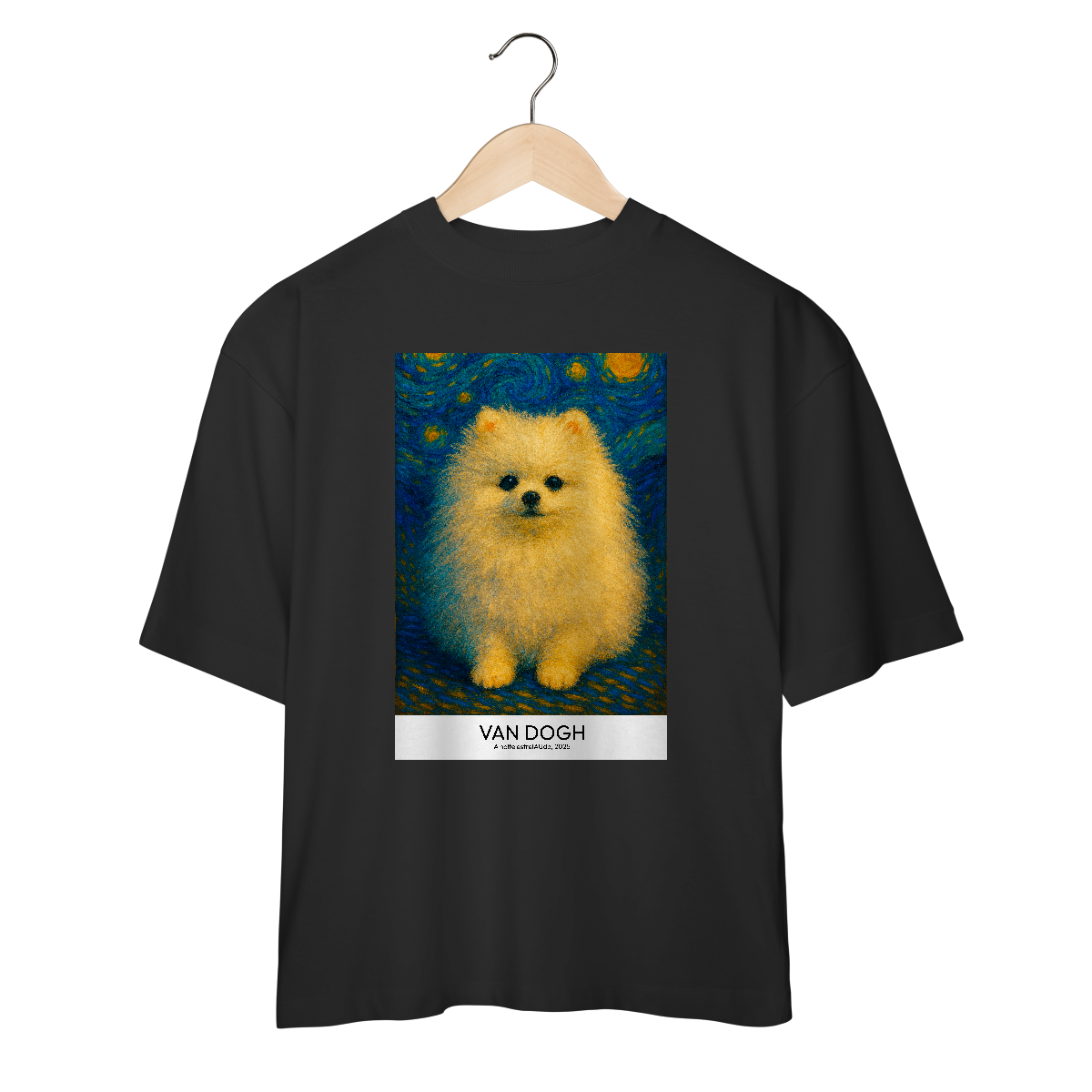 Conforto artístico para os amantes de cães! Camiseta oversized Catmosfera com a estampa "Noite Estrelada" de Van Gogh, apresentando um charmoso cachorrinho. Estilo folgado e uma homenagem única ao seu melhor amigo.