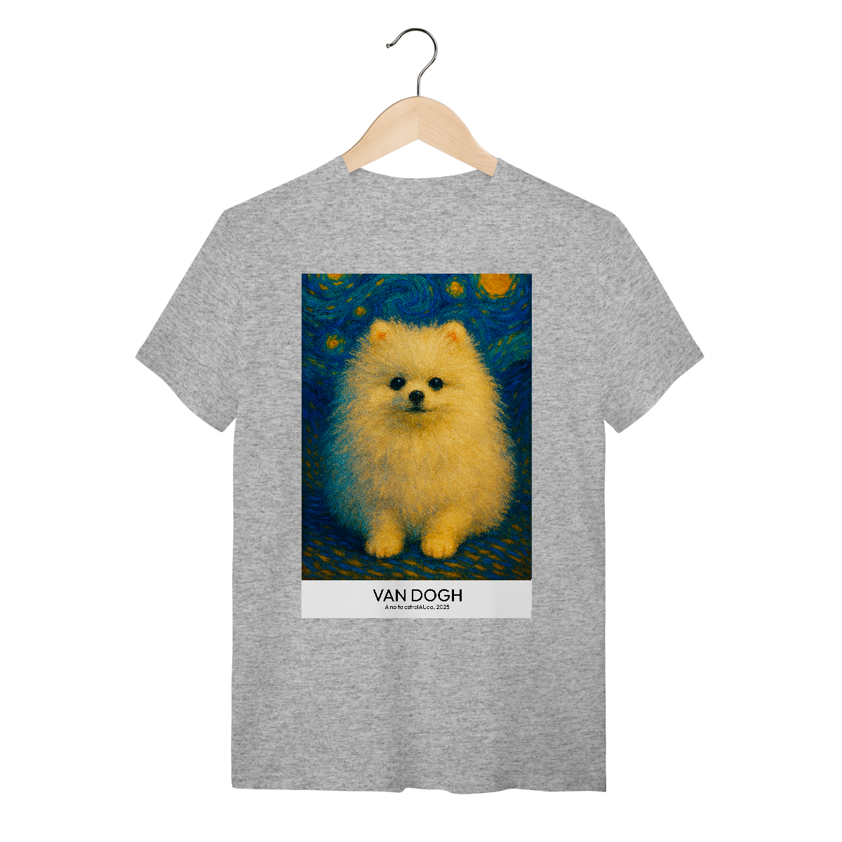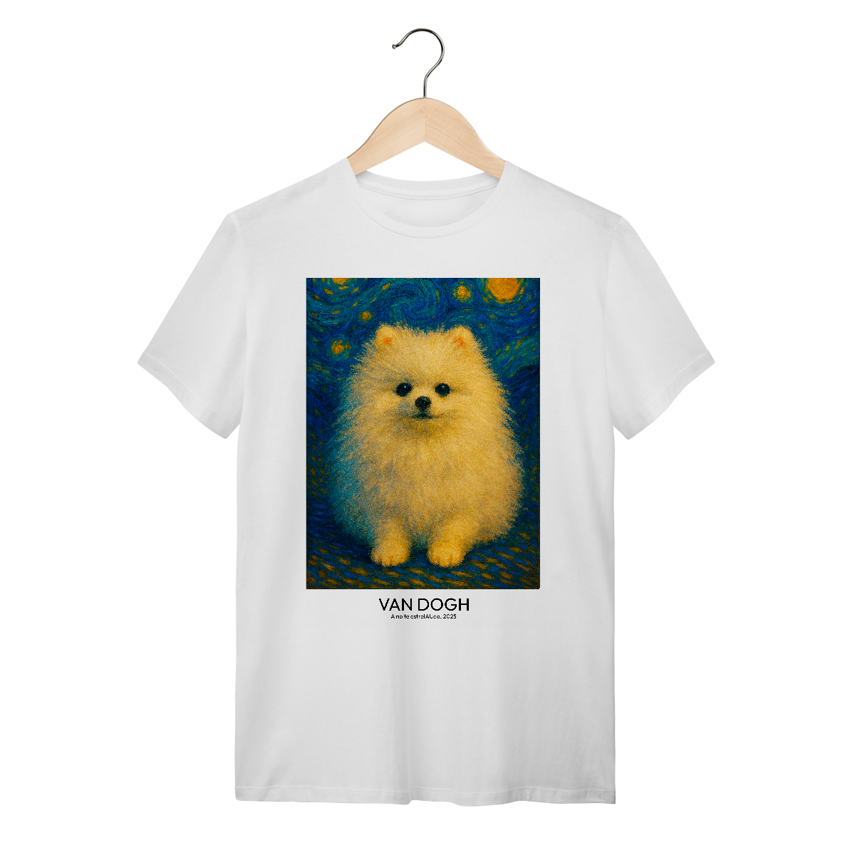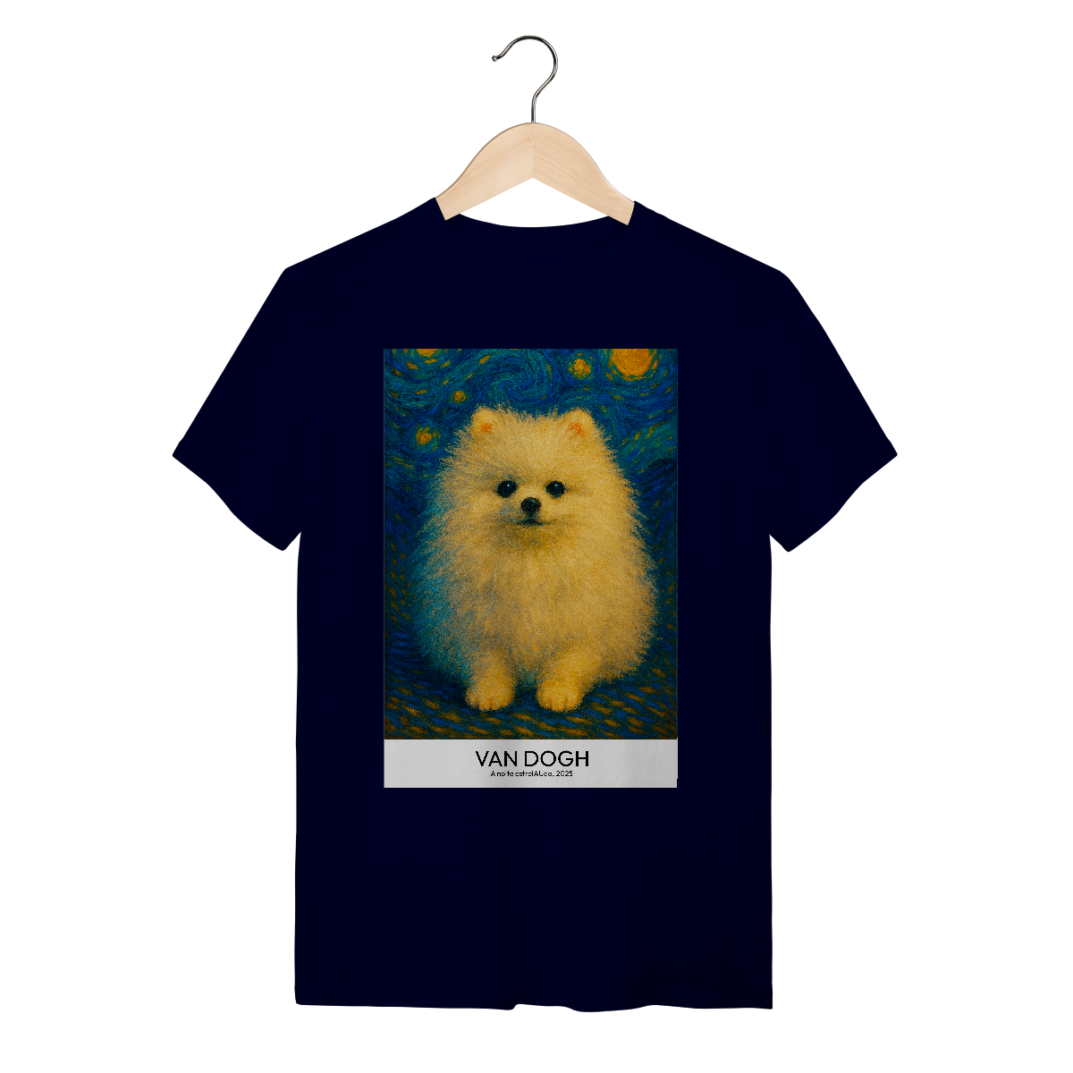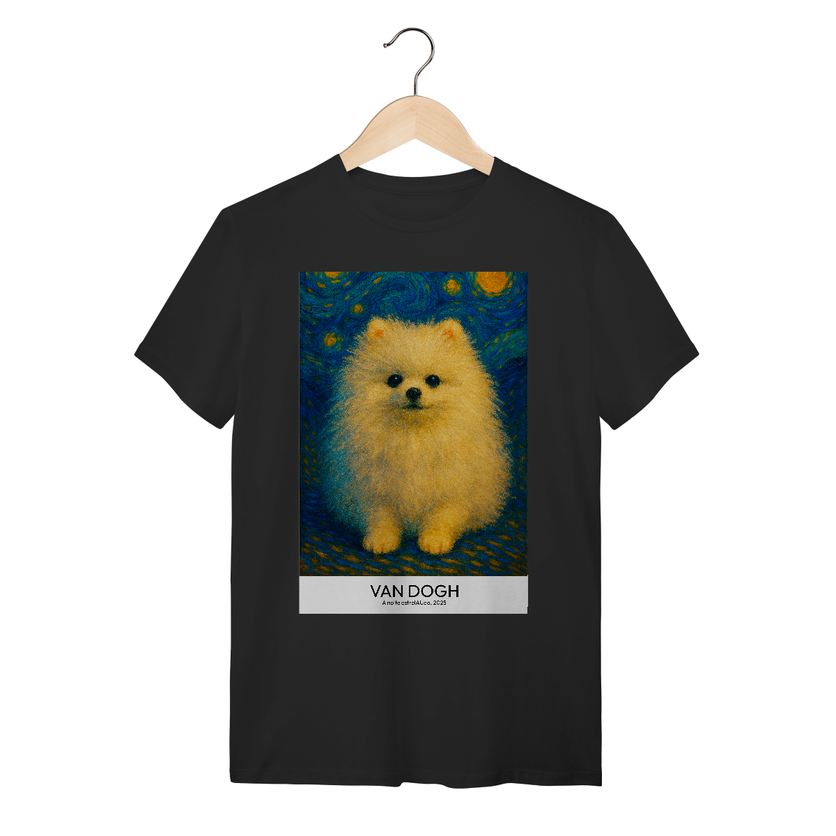 Celebre seu amor canino com arte! Camiseta Catmosfera com a estampa de um adorável cachorro no estilo "Noite Estrelada" de Van Gogh. Uma fusão única de arte e fofura para os amantes de cães com estilo.