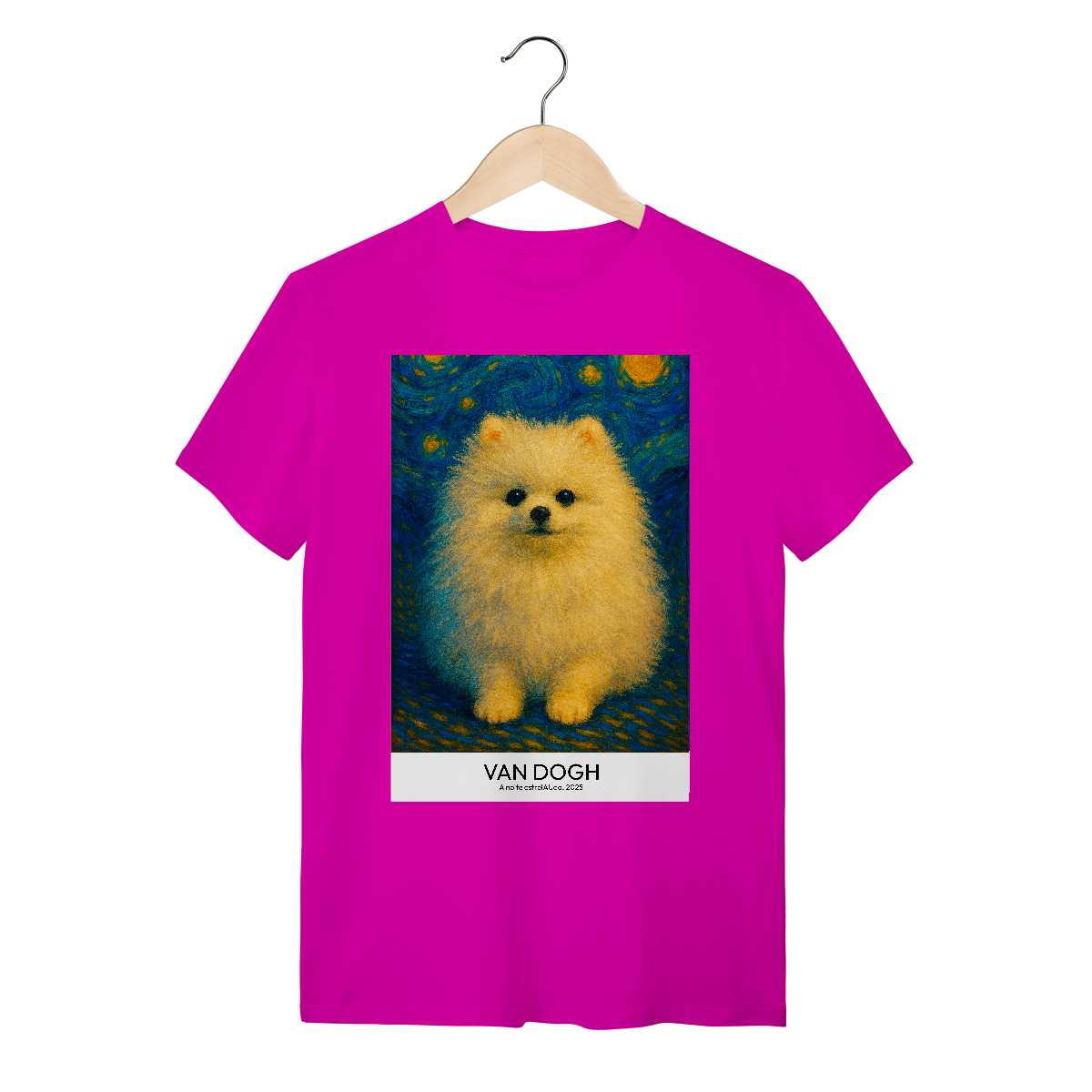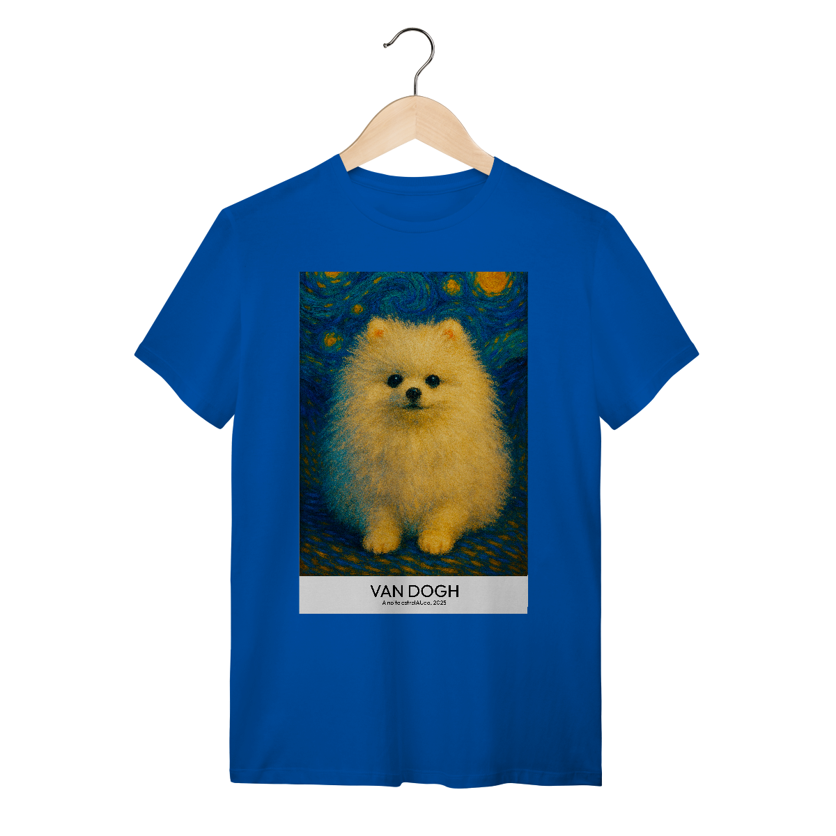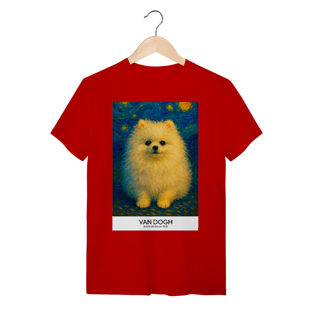 Celebre seu amor canino com arte! Camiseta Catmosfera com a estampa de um adorável cachorro no estilo "Noite Estrelada" de Van Gogh. Uma fusão única de arte e fofura para os amantes de cães com estilo.