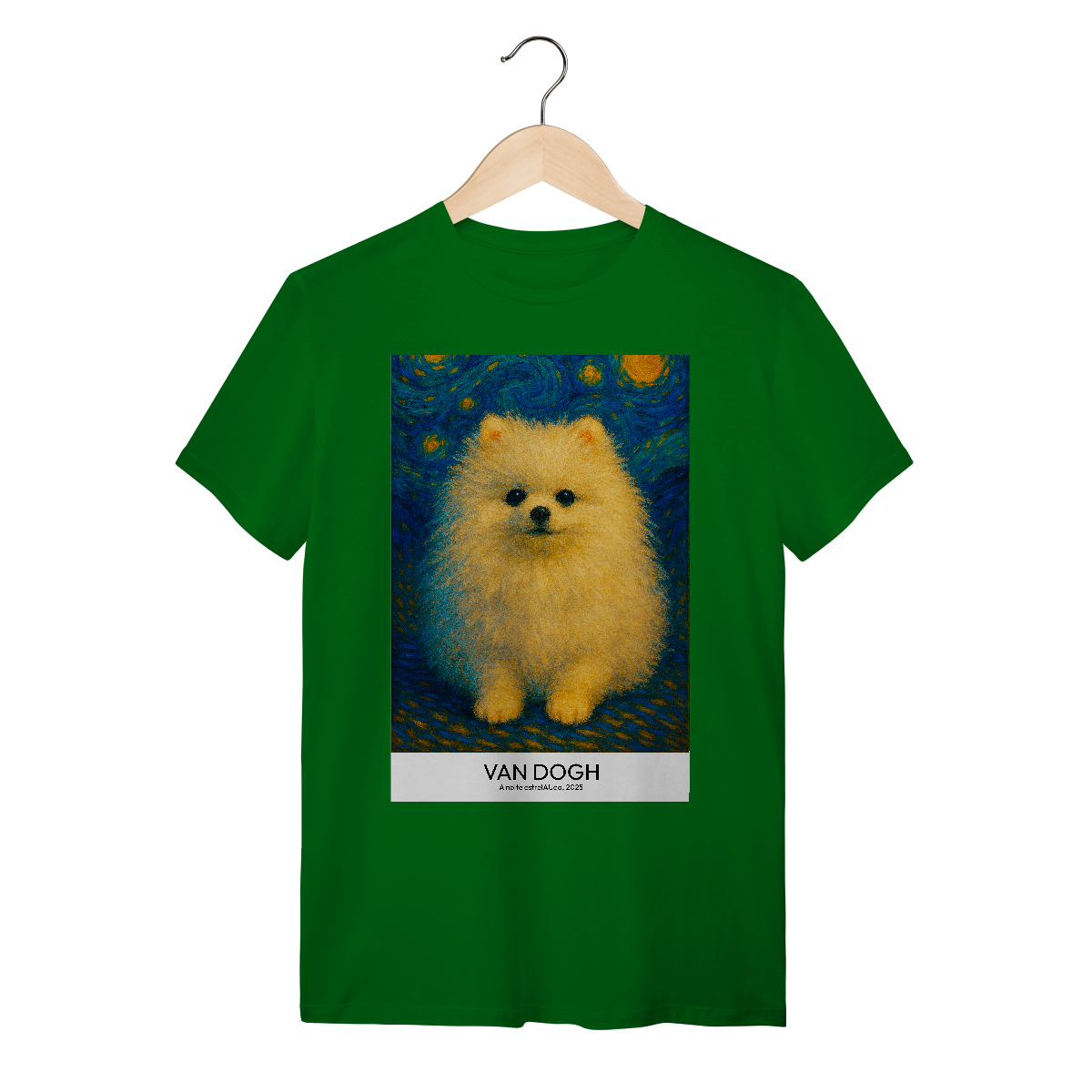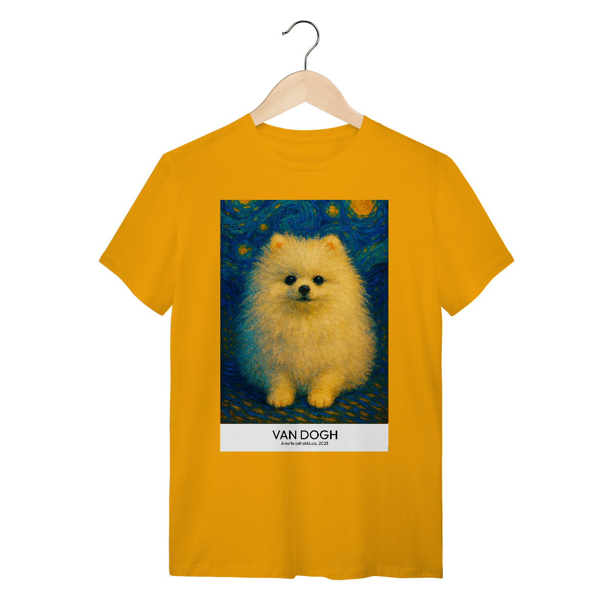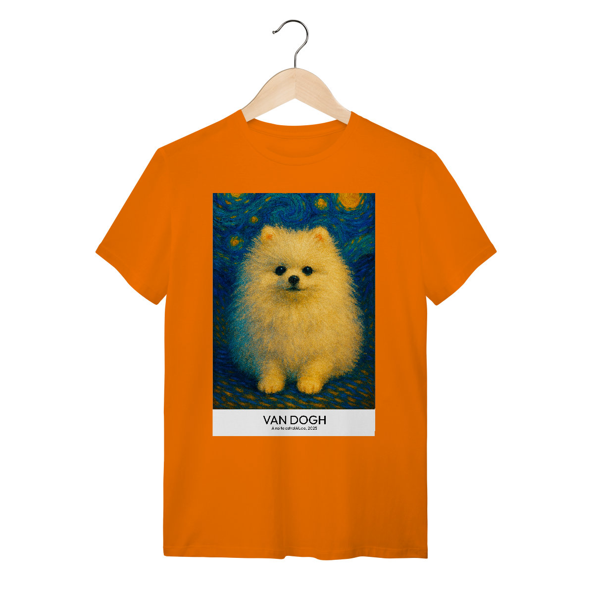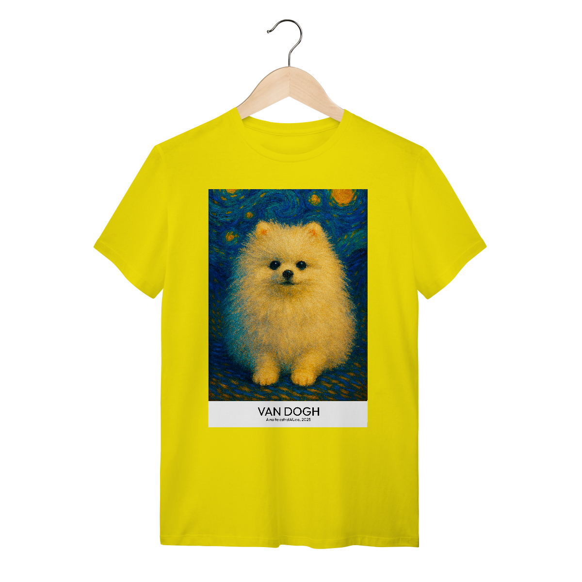 Celebre seu amor canino com arte! Camiseta Catmosfera com a estampa de um adorável cachorro no estilo "Noite Estrelada" de Van Gogh. Uma fusão única de arte e fofura para os amantes de cães com estilo.