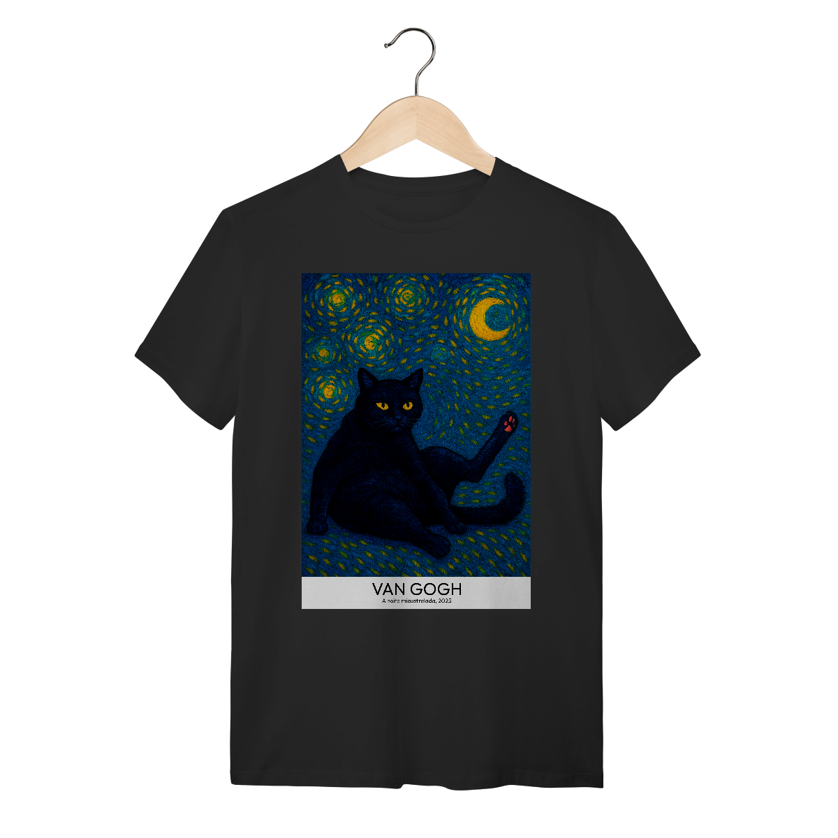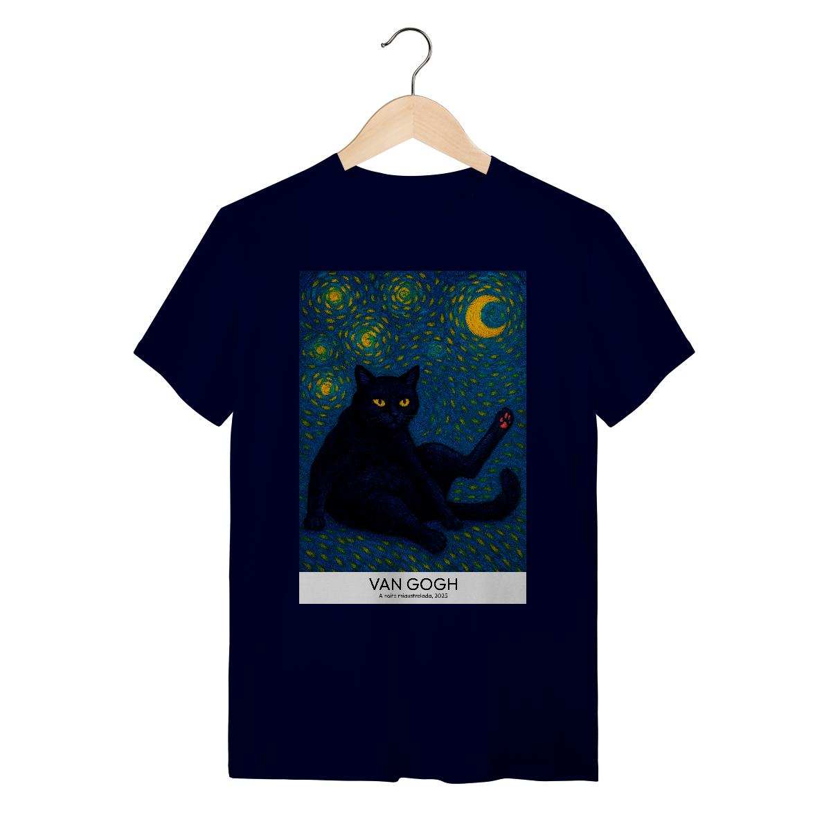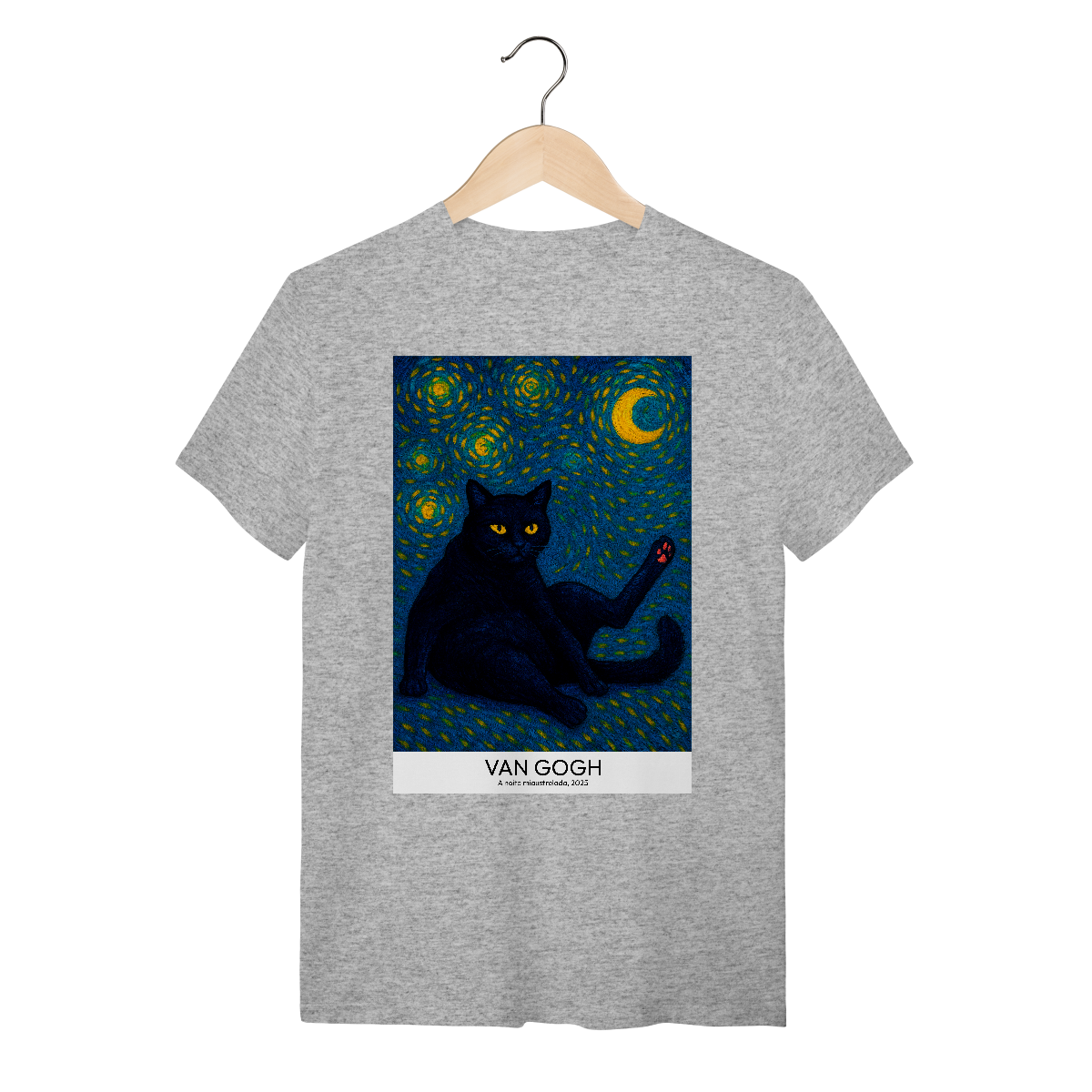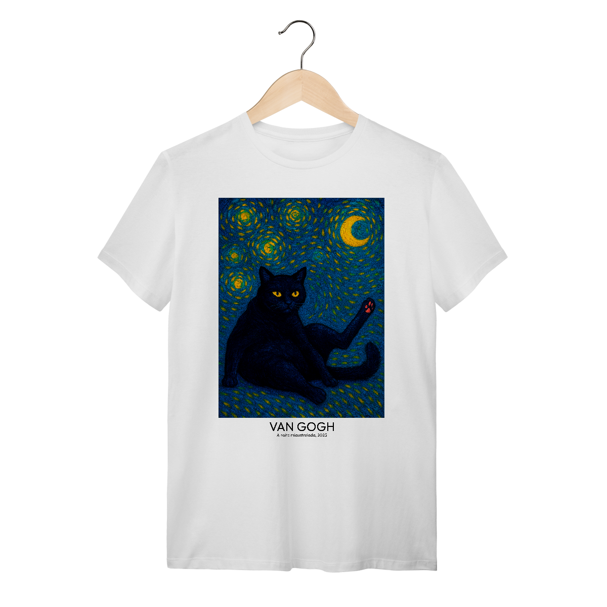 Vista uma obra de arte! Camiseta Catmosfera com a estampa "A Noite Miaustrelada" no estilo Van Gogh. Uma fusão perfeita de arte clássica e paixão felina. Expresse seu lado artístico e gateiro com estilo único.