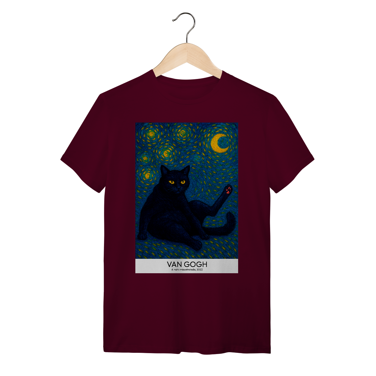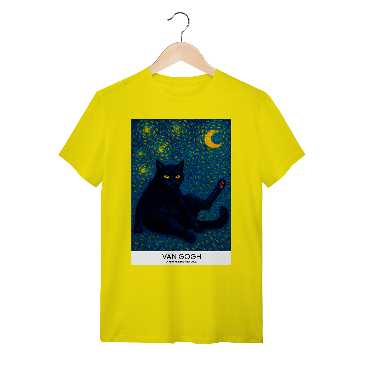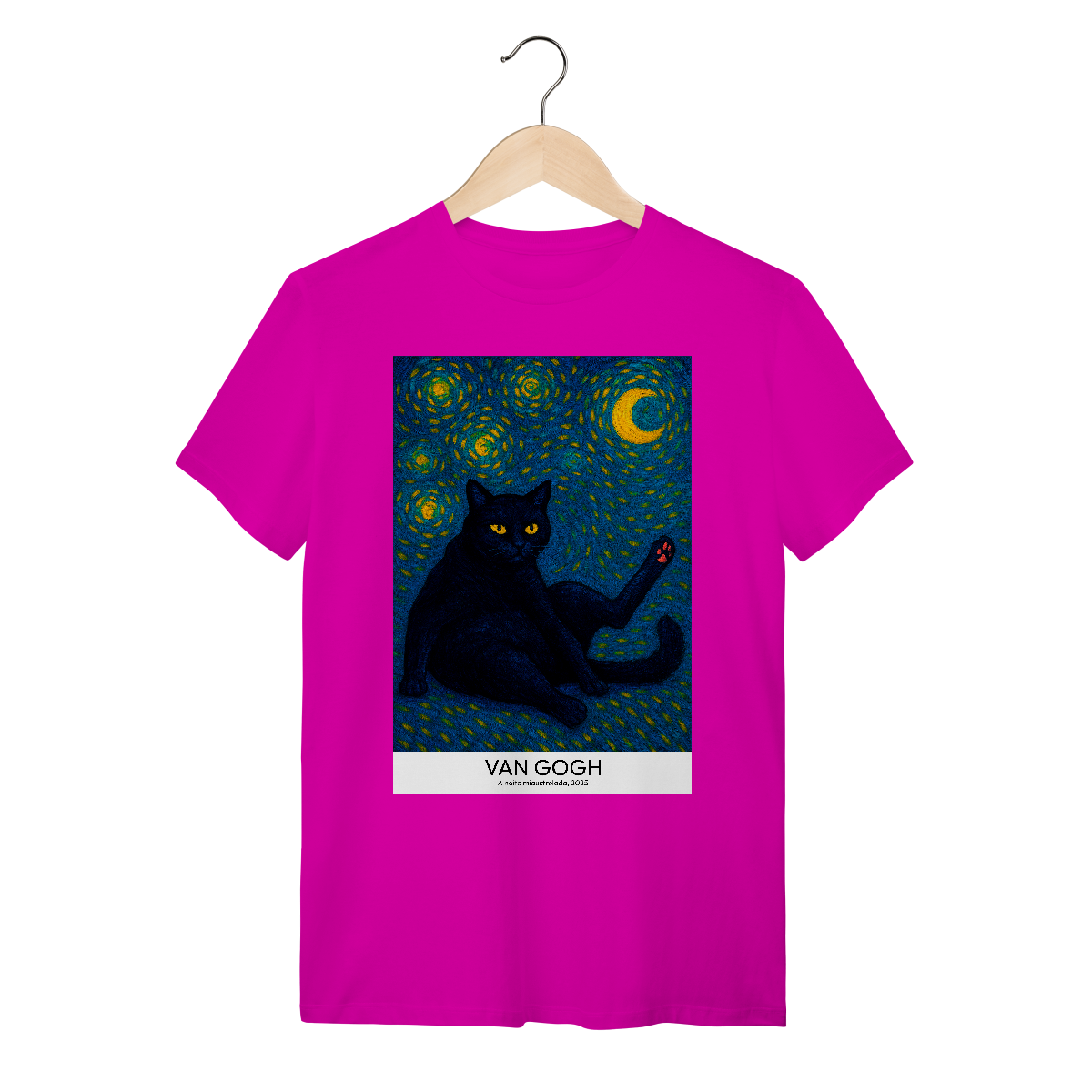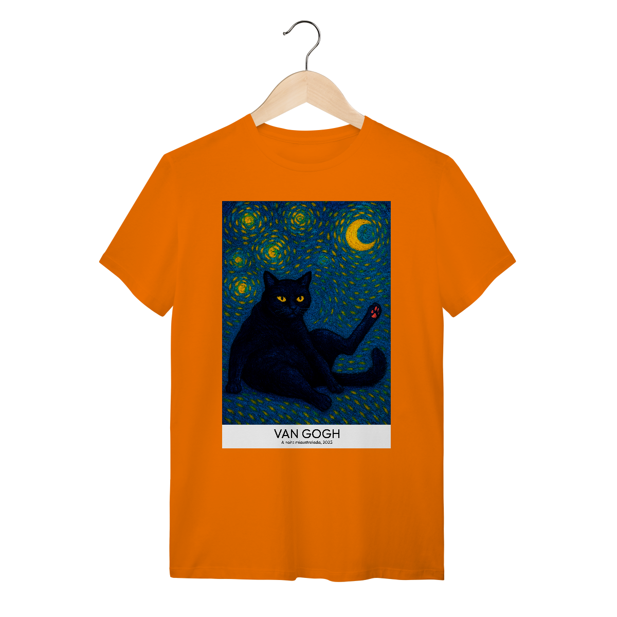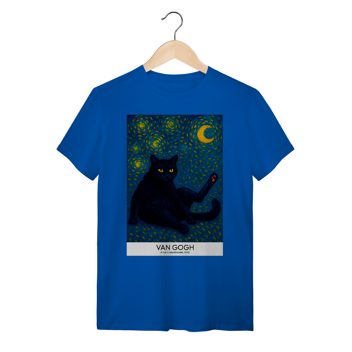 Vista uma obra de arte! Camiseta Catmosfera com a estampa "A Noite Miaustrelada" no estilo Van Gogh. Uma fusão perfeita de arte clássica e paixão felina. Expresse seu lado artístico e gateiro com estilo único.