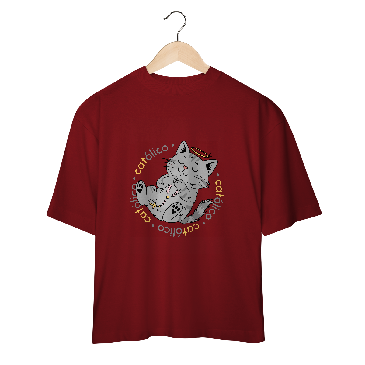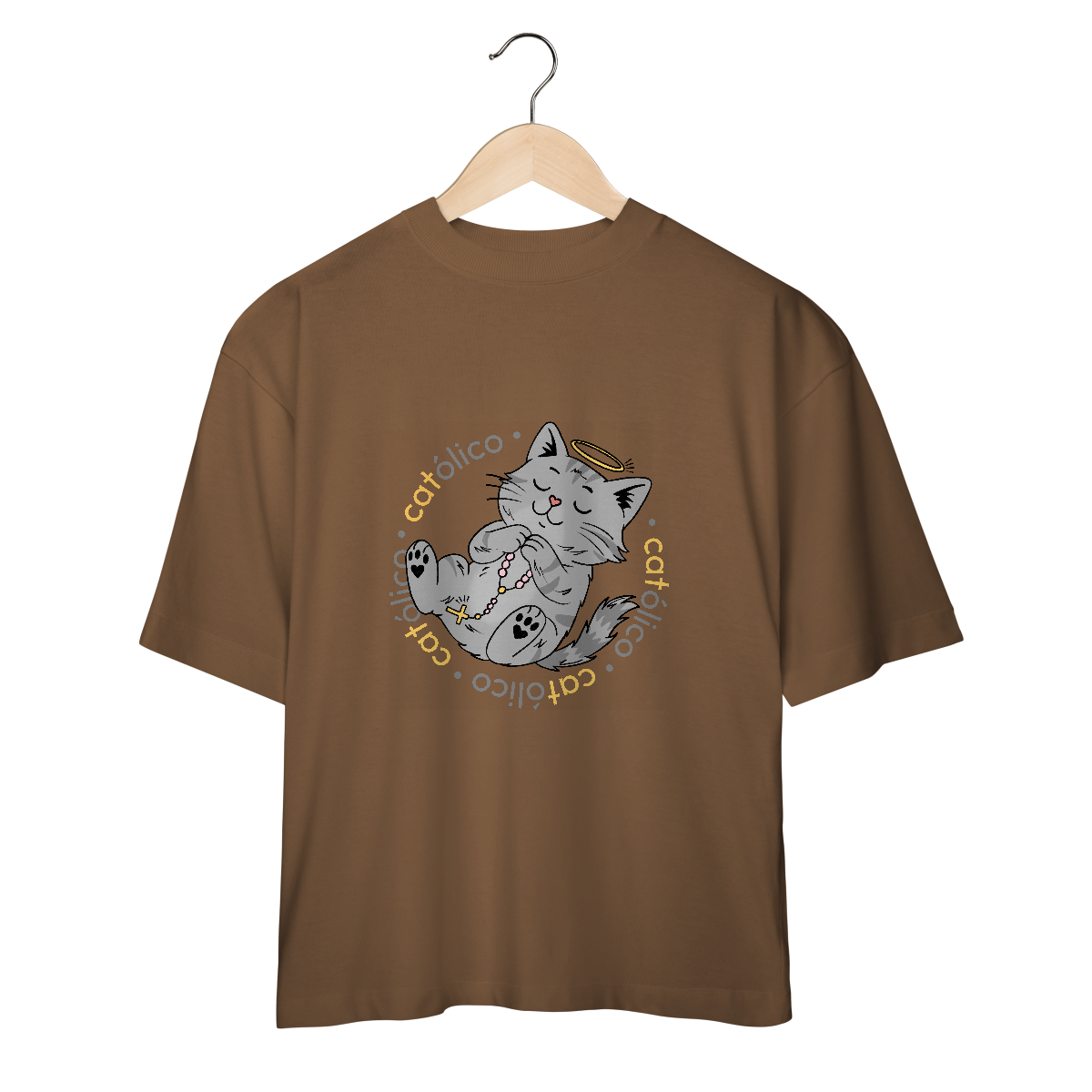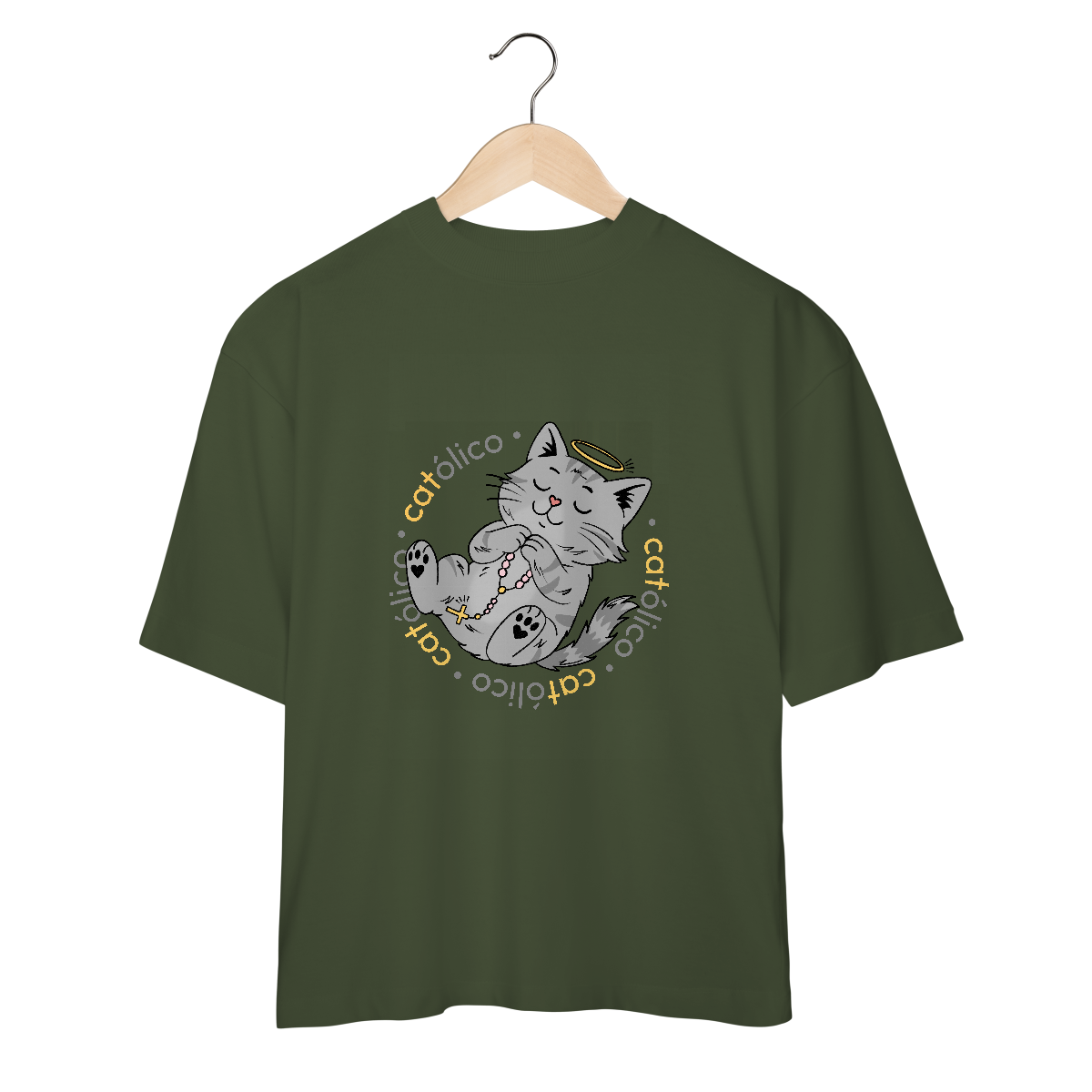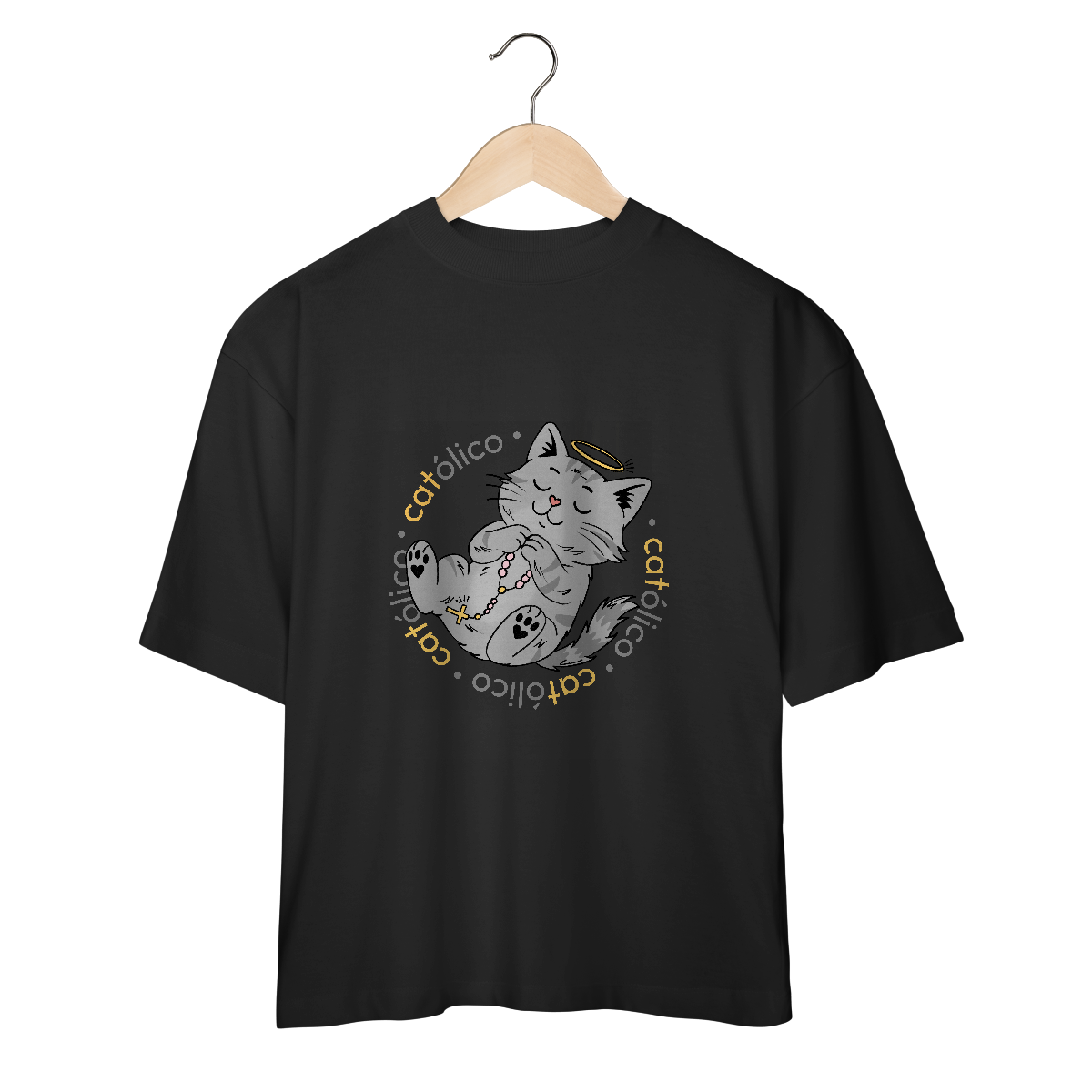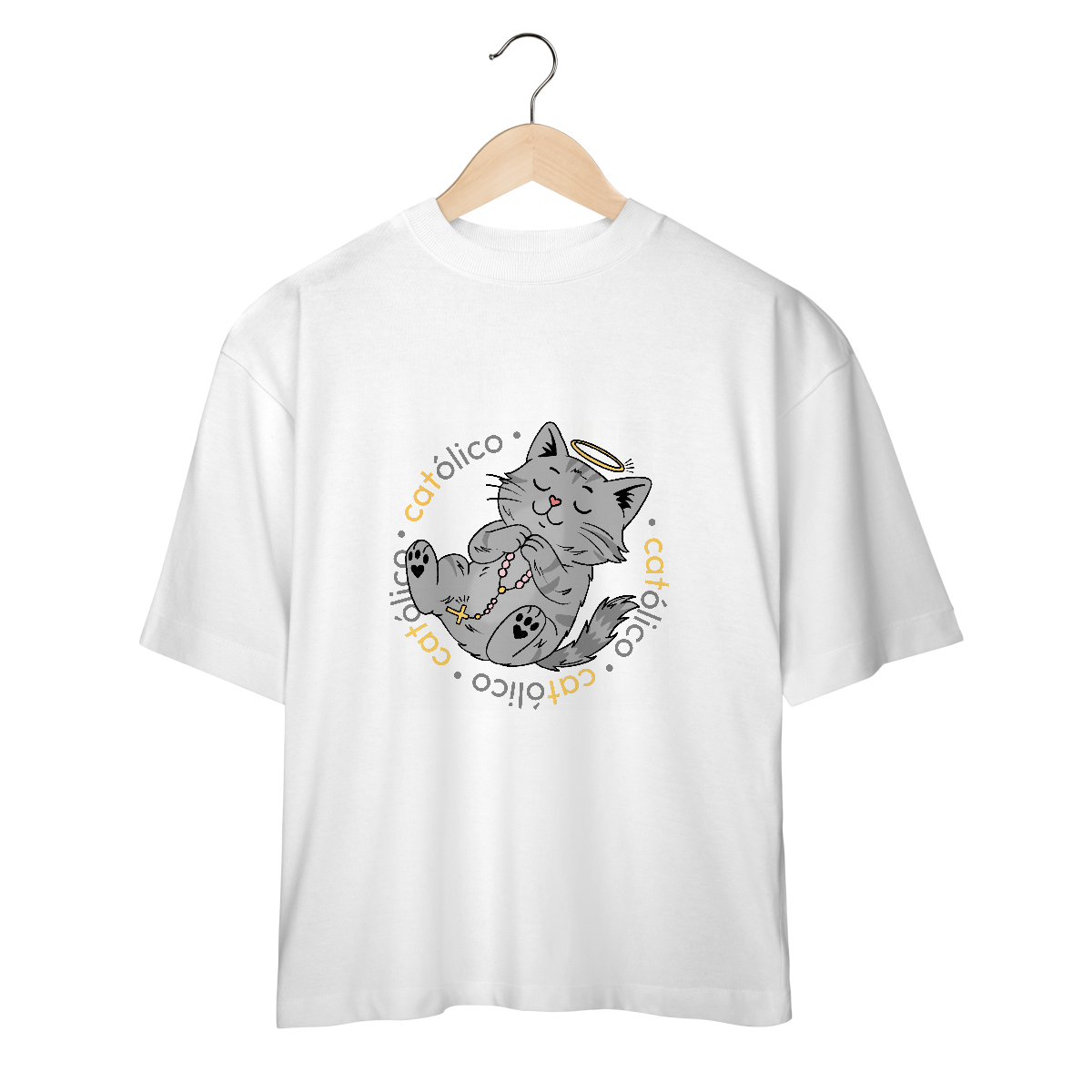 Vista sua fé e amor pelos felinos! Camiseta Catmosfera com a estampa Gato Católico. Um design único que celebra a devoção e a fofura dos seus bichanos. Conforto e espiritualidade para gateiros de coração.