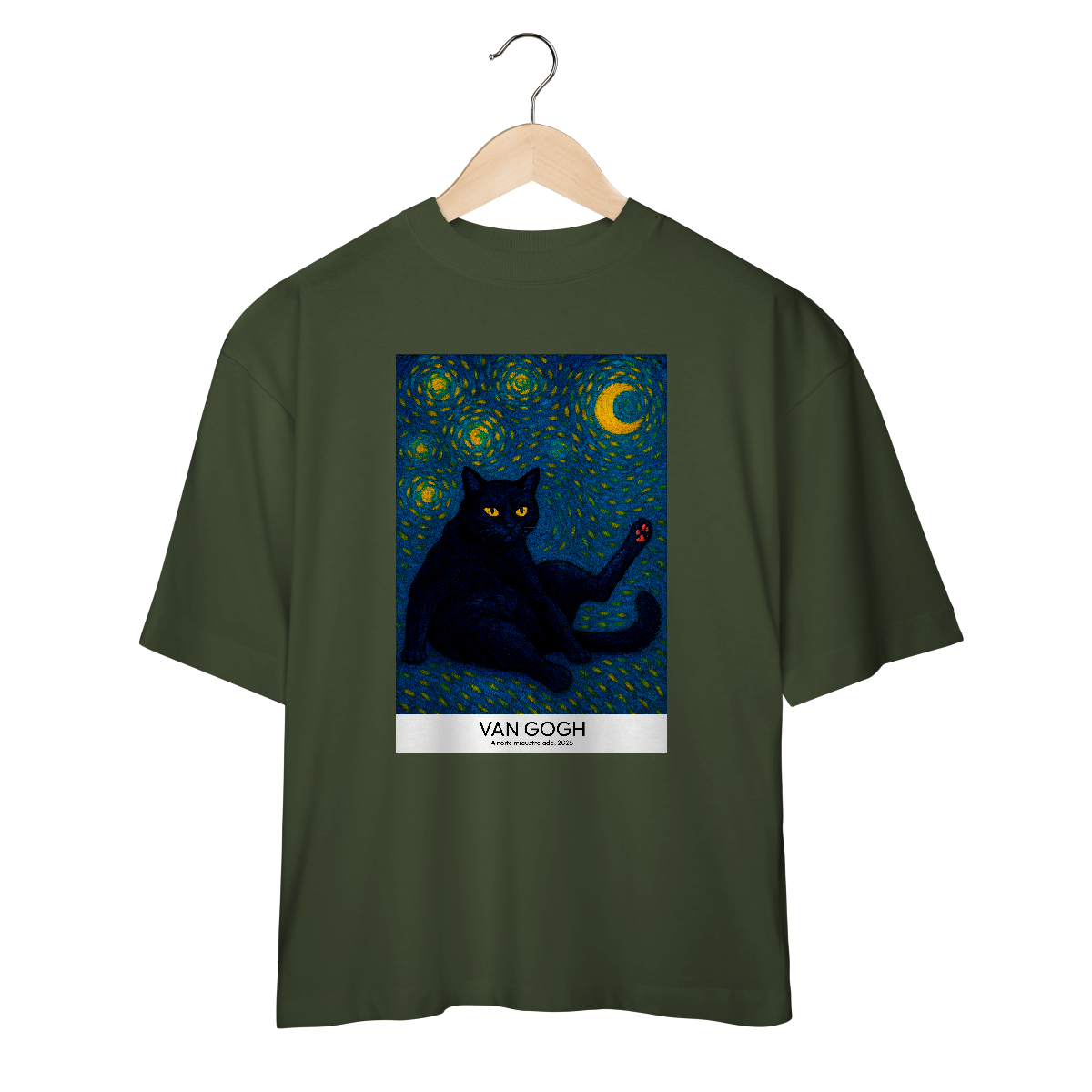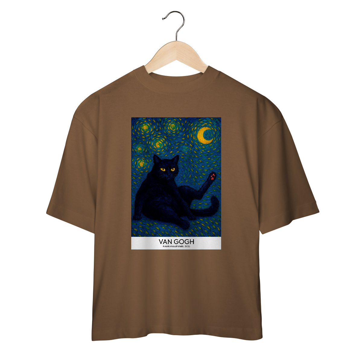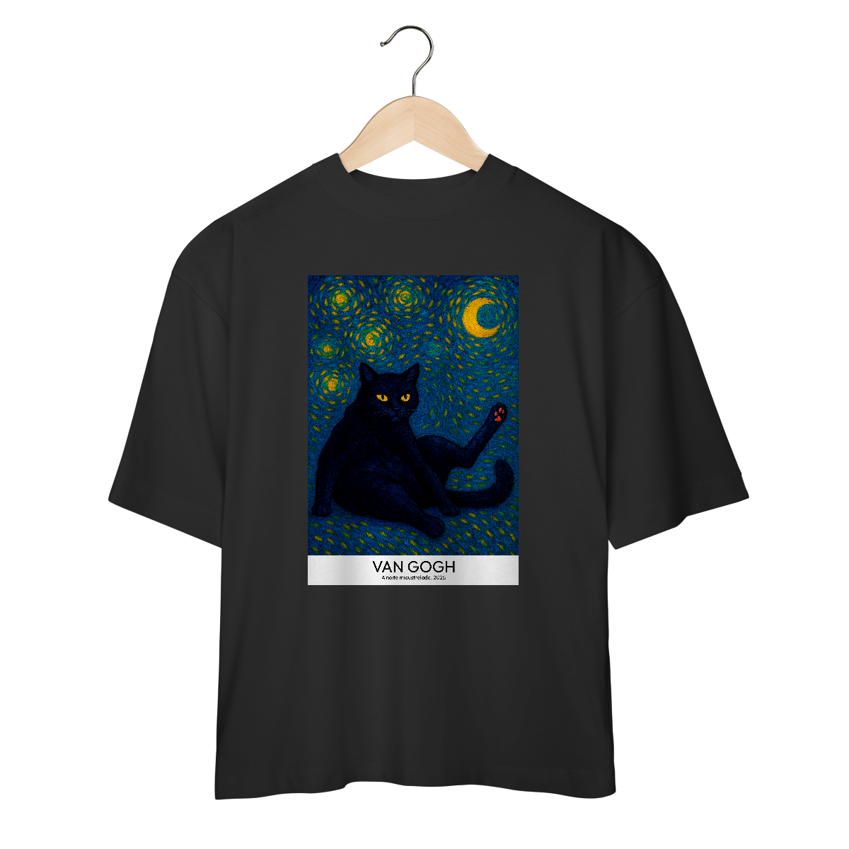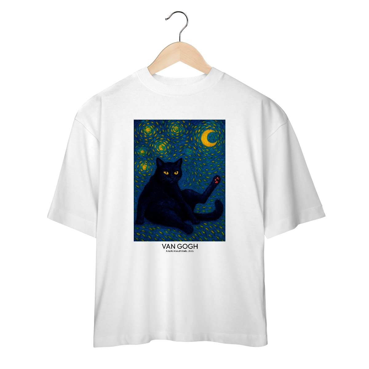 Conforto e arte em dose extra! Camiseta oversized Catmosfera com a icônica estampa "A Noite Miaustrelada" de Van Gogh. Design exclusivo para gateiros que amam arte e estilo folgado. Autenticidade e paixão felina.
