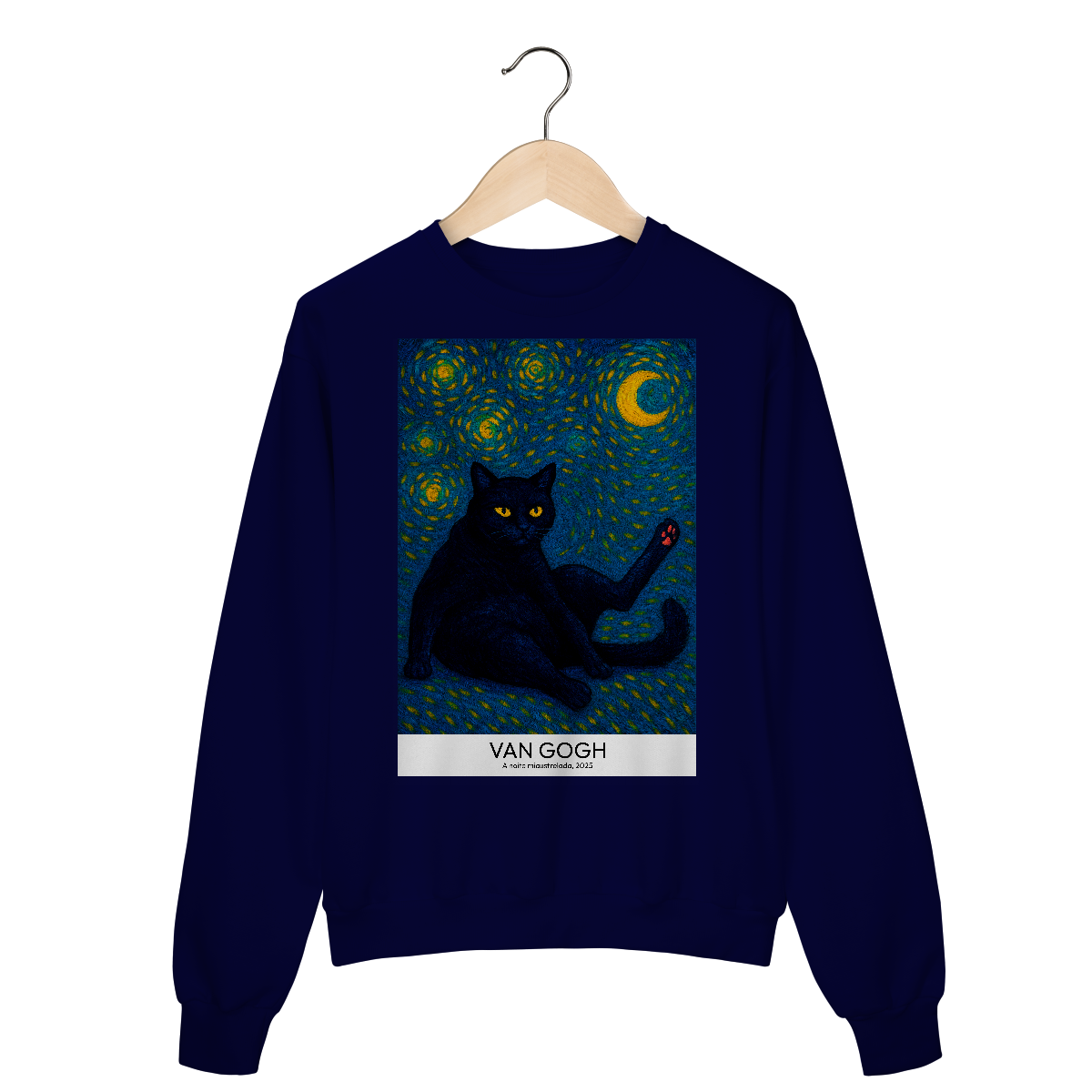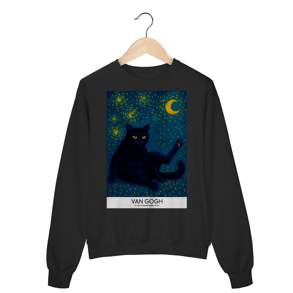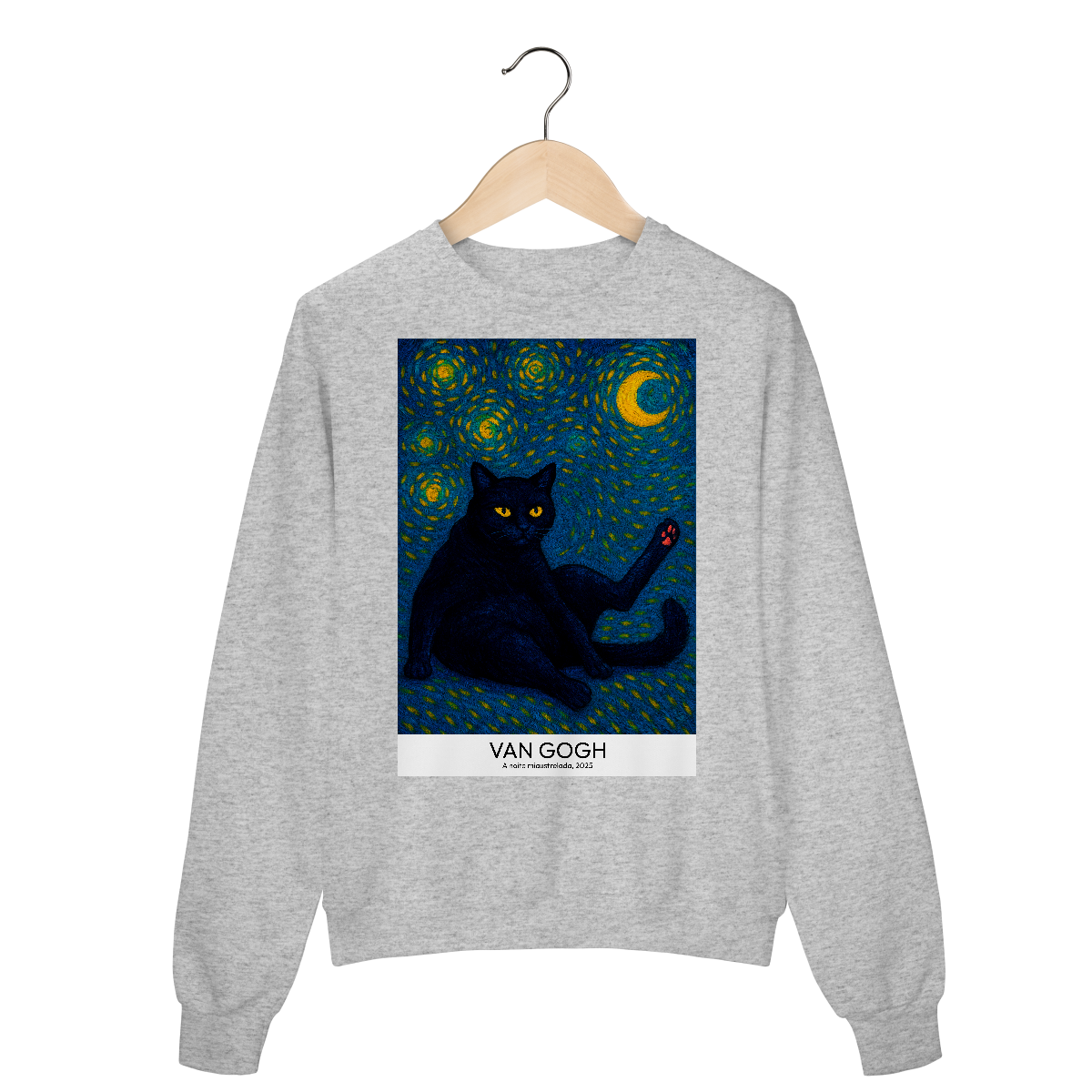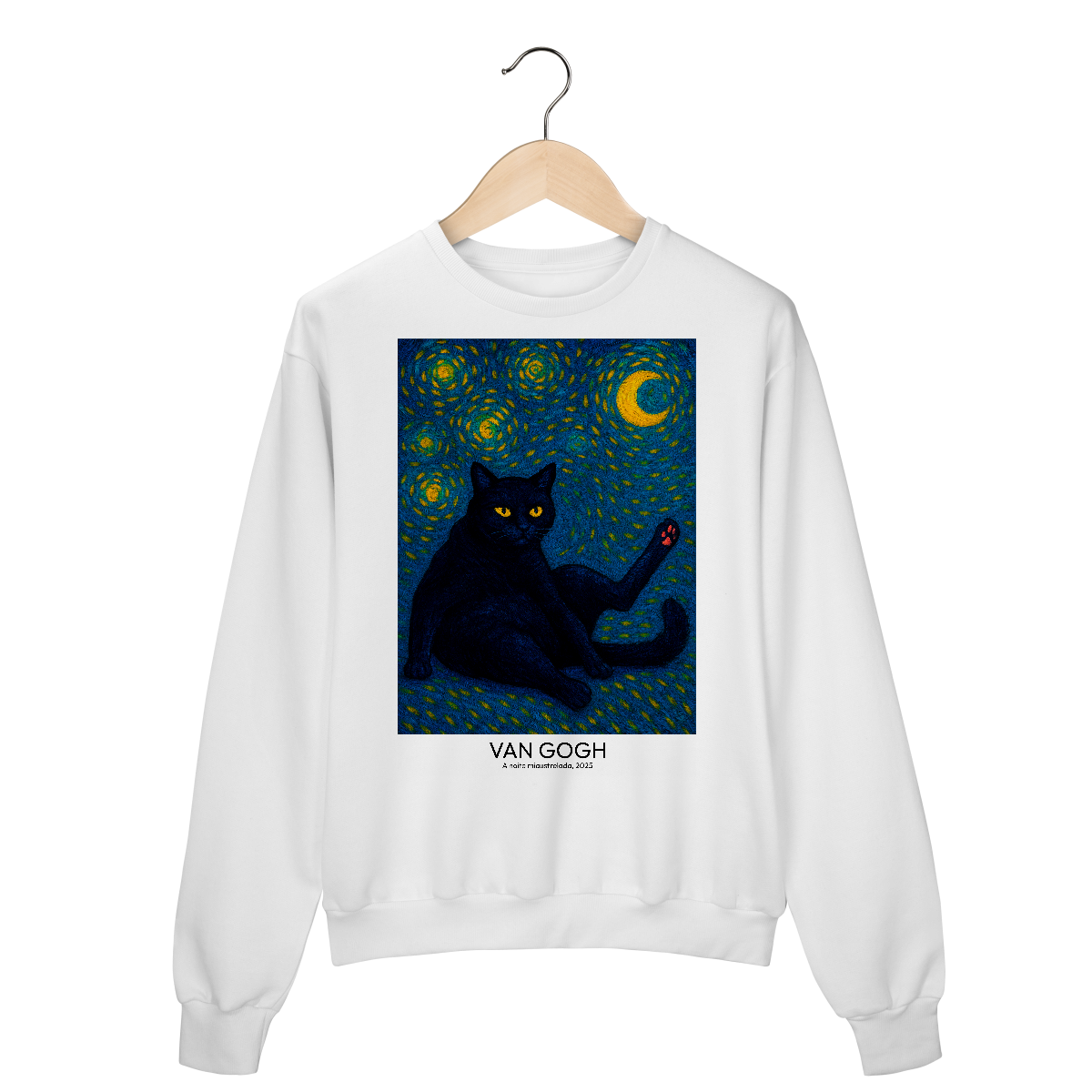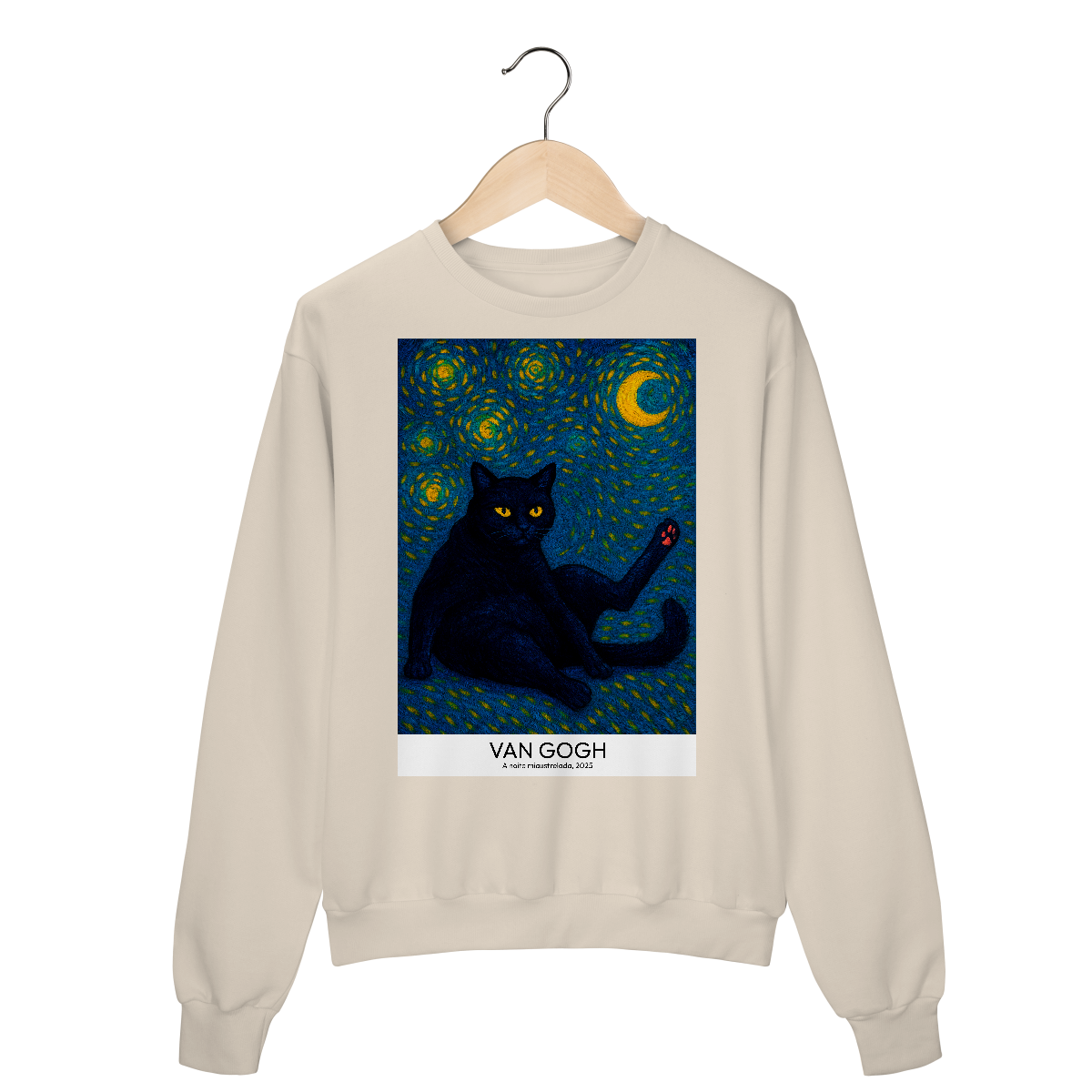 Aqueça-se com uma obra de arte! Moletom Catmosfera com a estampa "A Noite Miaustrelada", estilo Van Gogh. Conforto premium para gateiros que apreciam arte e a magia dos felinos. Vista sua paixão com estilo único!