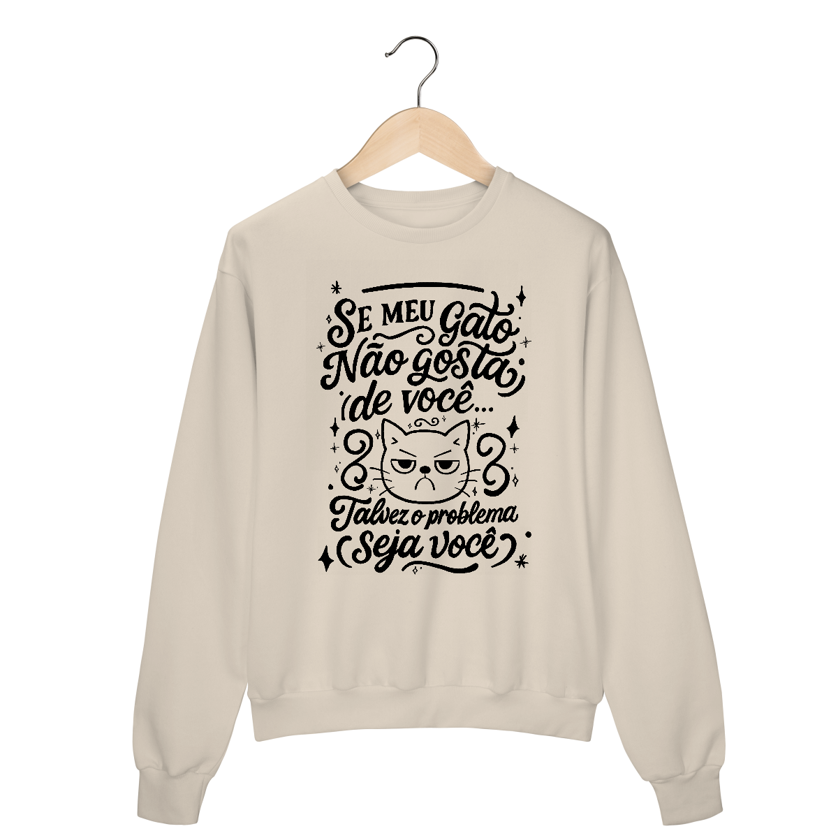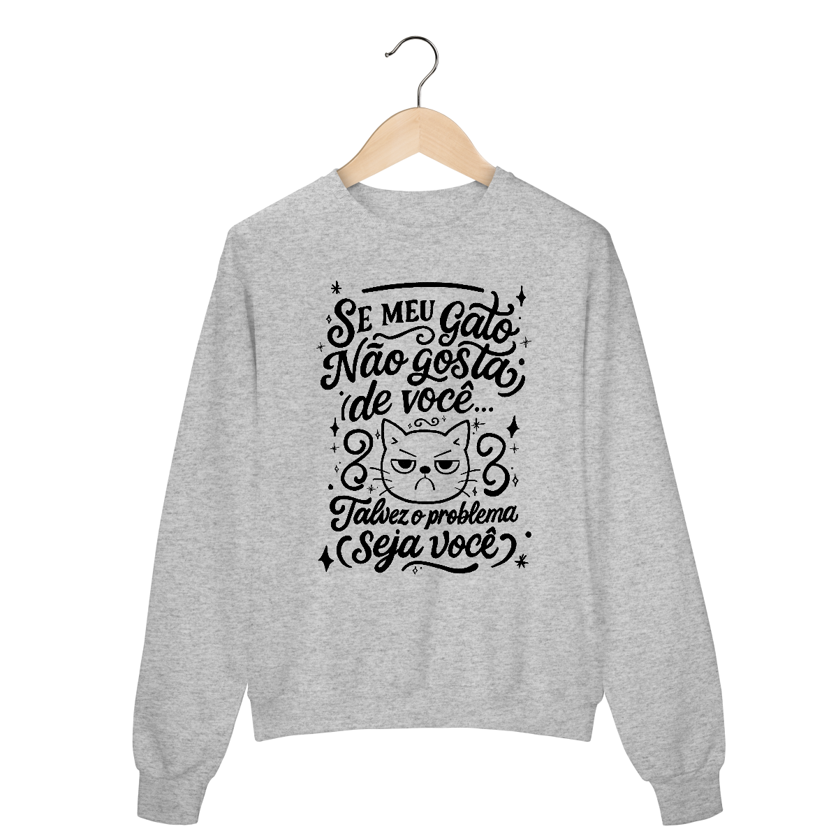 Mantenha-se quentinho e deixe o aviso claro! Moletom Catmosfera com a divertida estampa "Se meu gato não gosta de você... Talvez o problema seja você". Ideal para gateiros com atitude e senso de humor, perfeito para os dias mais frios.