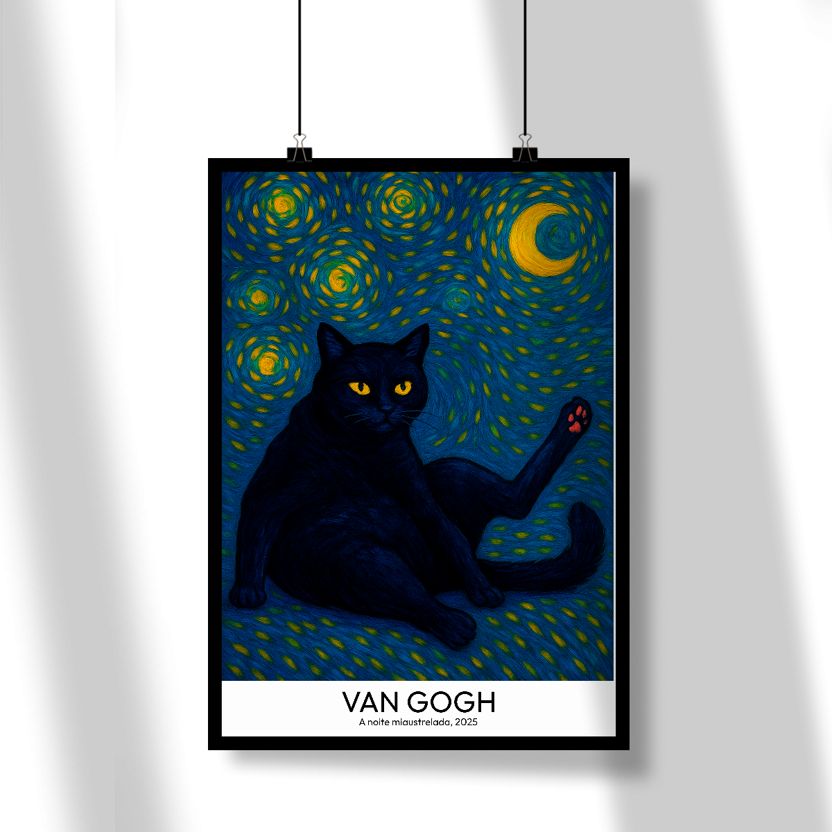 Transforme seu ambiente com arte felina! Cartaz exclusivo Catmosfera "A Noite Miaustrelada", inspirado em Van Gogh. Um gato preto em uma paisagem de sonho para amantes de arte e felinos. Decore com paixão e estilo único.